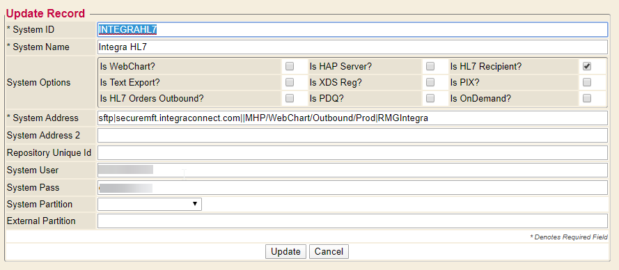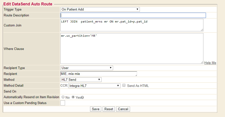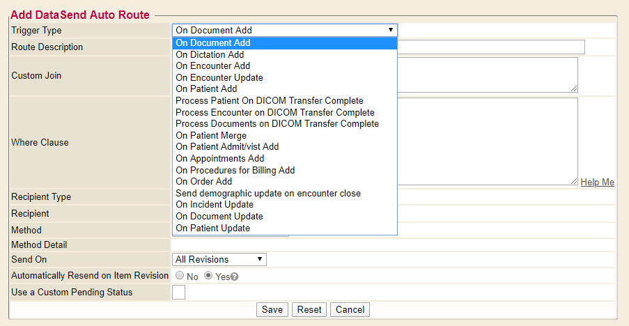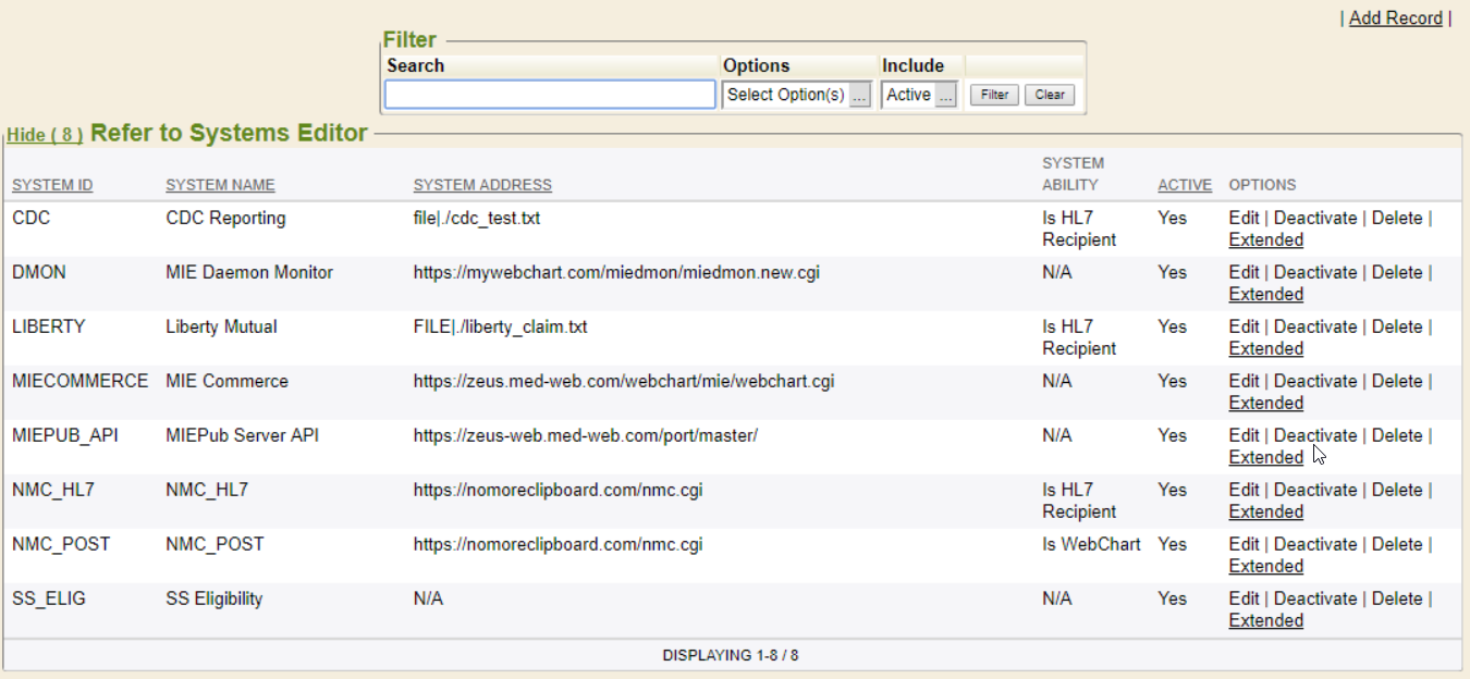 ## Overview 1. Understanding the end point to configure the Refer To Systems (RTS). 2. Understanding the trigger that will take place in WebChart to send the data to the end point to configure the Auto Route. ## Refer To Systems Refer To Systems (RTS) is used to manage connection details for vendors/services that receive data from WebChart. The RTS Editor is found in the Control Panel. It requires a permission level to access it. ![](./outbound-interface-install-instructions.assets/72d49a4da60ede7e9f94bdf983d46450.png) Each RTS entry contains: * System ID - This is a required unique identifier for the RTS * System Name - This is a human readable name for the entry. It is used when setting up Auto Routes and Performing Facilities on Lab Orders * System Address - This is the end point information. This can be a URL, Filename, SFTP, among others. * System Ability - This is a high level overview of what the connection is used for. HL7, Webchart to Webchart, among others * Active - This tells if the RTS is available for use. Inactive RTS cannot be sent to. * Options - This allows for Editing the RTS information, also to Deactivate, as well as Delete entirely. The Extended option is here as well to add special functionality when sending data over to this endpoint. ### System Address Here are the available connection options that the RTS editor supports ![](./outbound-interface-install-instructions.assets/723100db4503d34d573ec01166f3921f.png) 1. Socket a. Format: 'socket'|[IP address]|[port]|[SSL flag 1/0] ``` Example: socket|192.168.2.23|5321|0 ``` 2. File a. Format: 'file'|[file directory and name relative to where the datasend binary lives] ``` Example: file|../testfile.hl7 ``` 3. Multi-File a. Format: 'multi_file'|[file directory and beginning of filename to use] ``` Example: multi_file|../testmultifile ``` 4. SCP a. Format: 'scp'|[IP/hostname]|[port]|[subdir name]|[base filename]|[keyfile] i. Note username/password are on the RTS entry itself ``` Example: scp|192.168.34.27||data/outbound|testfile.dat| ``` 5. SFTP a. Format: 'sftp'|[IP/hostname]|[port]|[subdir name]|[base filename]|[keyfile] i. Note username/password are on the RTS entry itself ``` Example: sftp|192.168.34.27||data/outbound|testfile.dat| ``` 6. HTTPS (default) a. Format: [URL]|[username CGI variable name]|[password CGI variable name]|[message CGI variable name] i. Note username/password are on the RTS entry itself ``` Example: https://mywebchart.com/omg/webchart.cgi|login_user|login_passwd|message ``` ### System Ability Here are the types of outbound messages that can be configured for each RTS endpoint. Selecting these determines how they are represented inside of Webchart and EH. ![](./outbound-interface-install-instructions.assets/92e9971f0032eafe76fe1f520a8a4a8a.png) 1. Is WebChart? a. For sending messages between 2 Webchart systems 2. Is HAP Server? a. Specifies that this can be used as a remote chart HAP System endpoint in the ChartTabs editor. 3. Is HL7 Recipient? a. For sending HL7 data to a system 4. Is Text Export? a. Specifies that this can be used as a Text Export endpoint in the Send dialog and Auto Routes editor. 5. Is XDS Reg? a. For sending via XDS. 6. Is PIX? a. Specifies that this is a PIX Manager and is suitable as an endpoint for performing ITI-9 PIX queries. 7. Is HL7 Orders Outbound? a. For sending HL7 Orders to a system 8. Is PDQ? a. Specifies that this a Patient Demographics Supplier and is suitable as an endpoint for performing ITI-21 PDQ queries. 9. Is OnDemand? a. Specifies that any outgoing XDR submissions are to be registered as On-Demand documents rather than static documents. ## Auto Routes There are many available triggers * On Document Add/Update - creates MDM, VXU or ORU * On Patient Add/Update - creates ADT * On Appointments Add - creates SIU * On Procedures for Billing Add - creates DFT ![](./outbound-interface-install-instructions.assets/8e32d4f5d4eff16fb06c8f84f057ad51.png) JOINs and WHERE clause * This allows for more filtering to work with specific sets of patients. Requires some understanding of the Webchart DB schema. Generally requires MIE EDI team to build. However, manually copying Auto Route JOINs and WHERE Clauses into new Auto Routes is also possible. * The Help Me feature allows non-power users to build their own commonly used Join/Where clauses. ![](./outbound-interface-install-instructions.assets/59a0d8603cce1b3d57bd468474affaf5.png) There are many available send options * HL7 Send - this will send out HL7 messages ![](./outbound-interface-install-instructions.assets/c33547588cf502a12090664e7feb0029.png) ## Testing and Verifying Once records are added into Webchart and the triggers are satisfied, the HL7 message should send out according to the RTS. To validate that the data was sent outbound successfully, browse to the DataSend Queue in Control Panel -> Interfaces. The Send Queue has reports that show the records * In Progress - messages currently being sent to the RTS End point * Pending - messages waiting to be sent to the RTS End point * Error - messages that were unable to send successfully * Completed/Acknowledged - messages that were sent successfully ![](./outbound-interface-install-instructions.assets/3419ef2e1d3141f5c0dd86c3f1216ea1.png) Resending messages is possible for Completed messages using the Options *Resend* link ![](./outbound-interface-install-instructions.assets/cd194d4525be59d9453a9406d22038ef.png)
